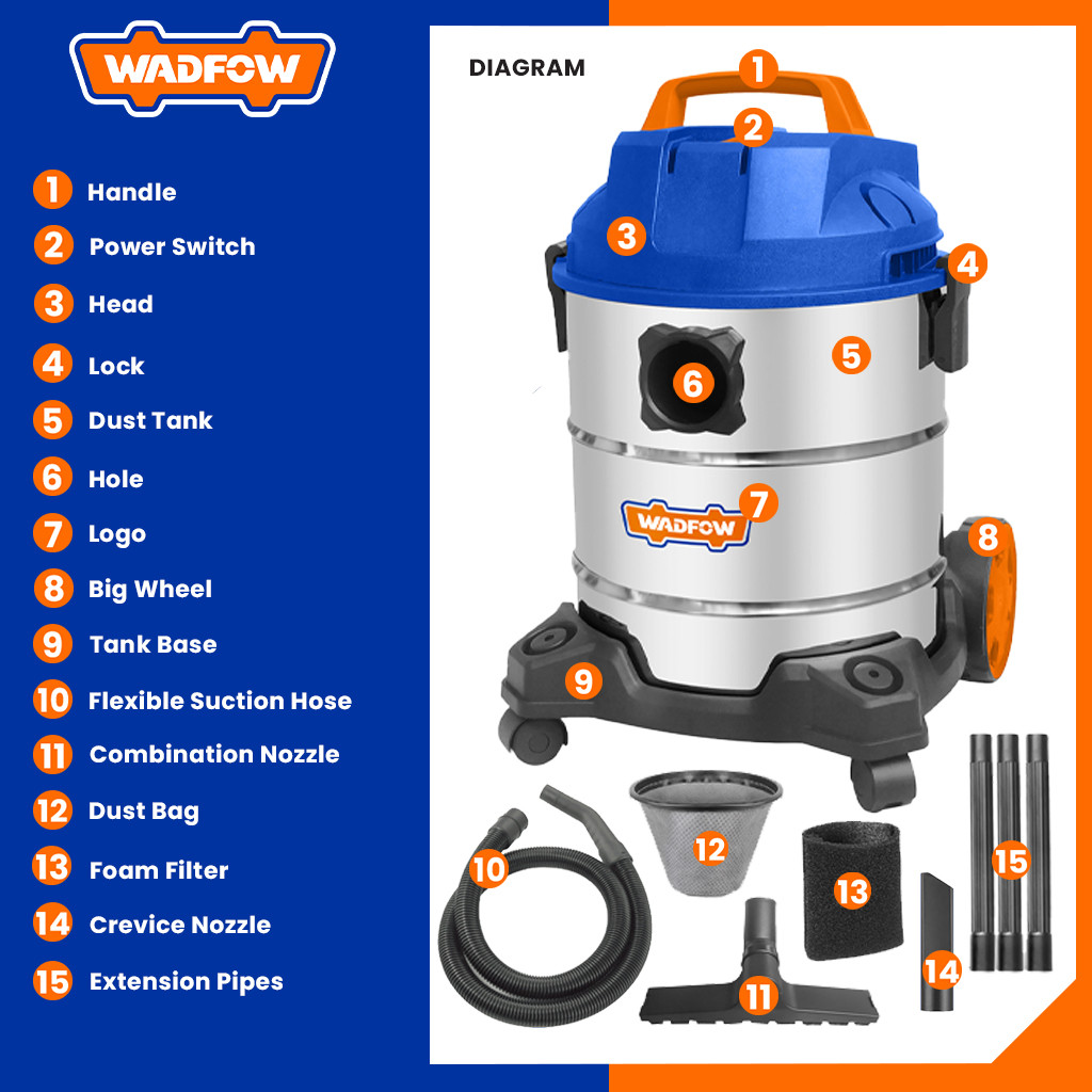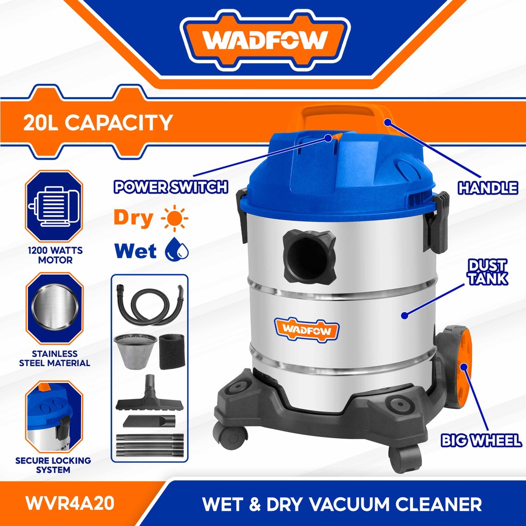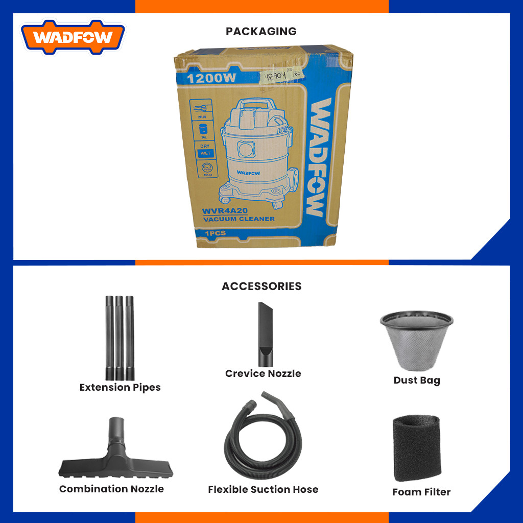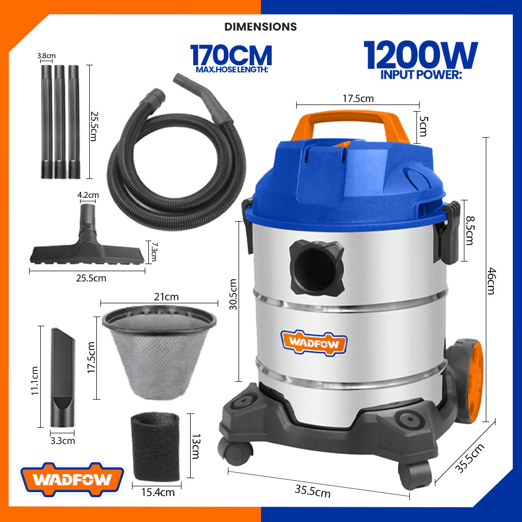 Wadfow 20 Liters Wet & Dry Vacuum Cleaner Capacity Household Floor Cleaning Tools 1200W