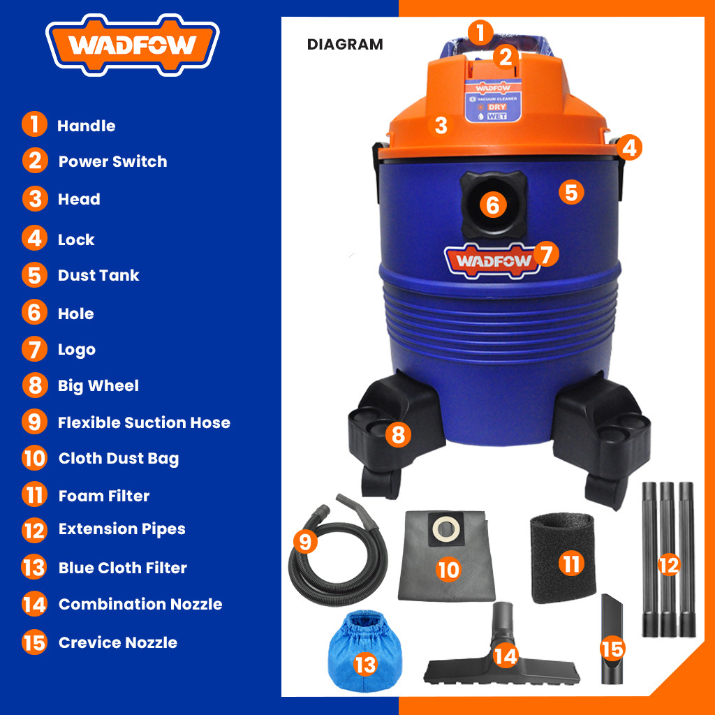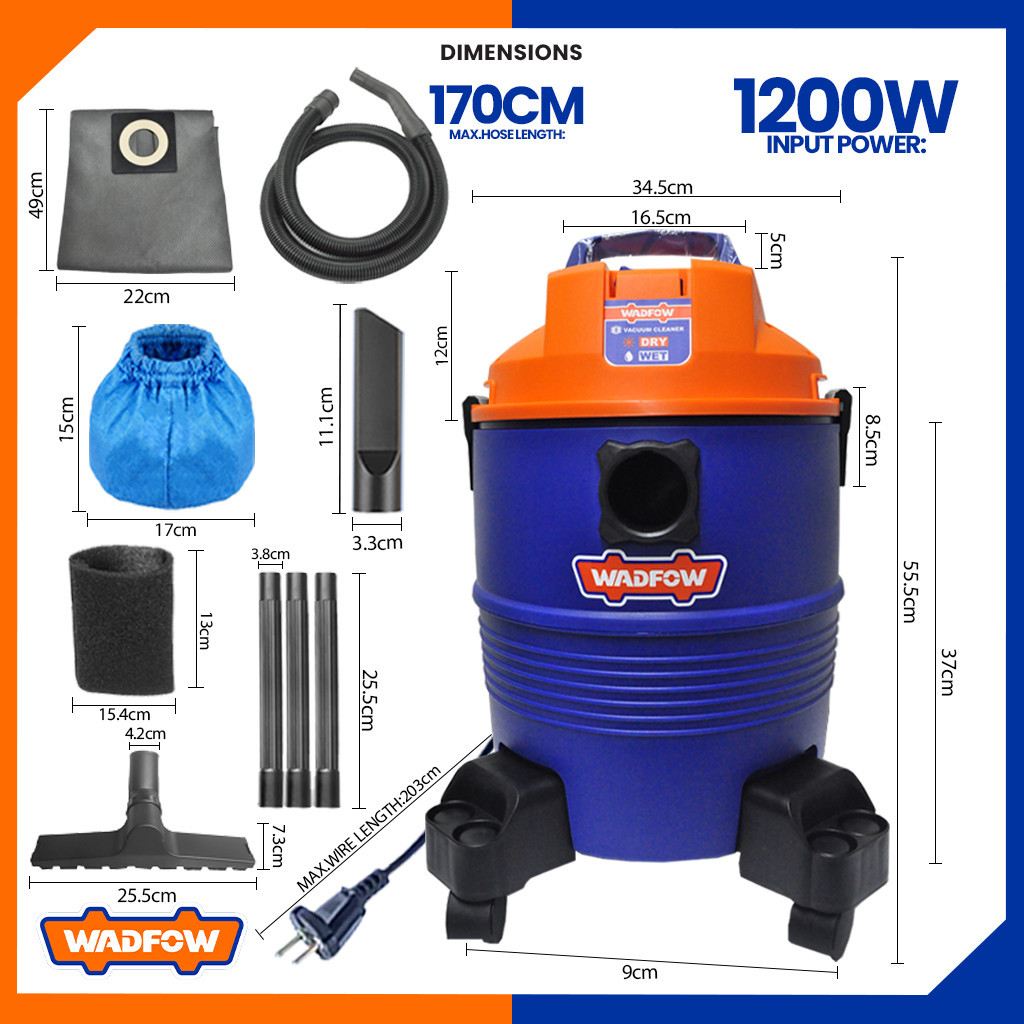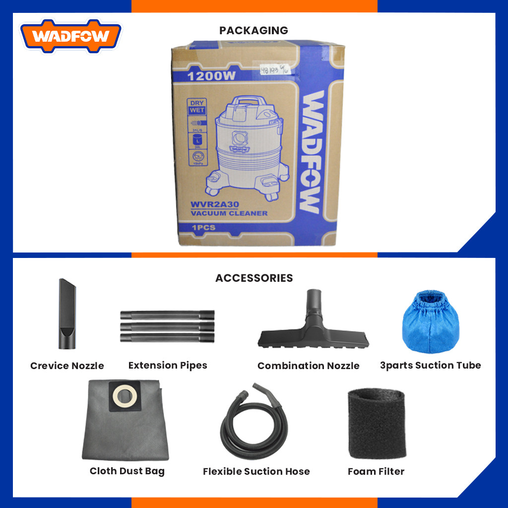 Wadfow 30 Liters Wet & Dry Vacuum Cleaner Capacity Household Floor Cleaning Tools 1200W